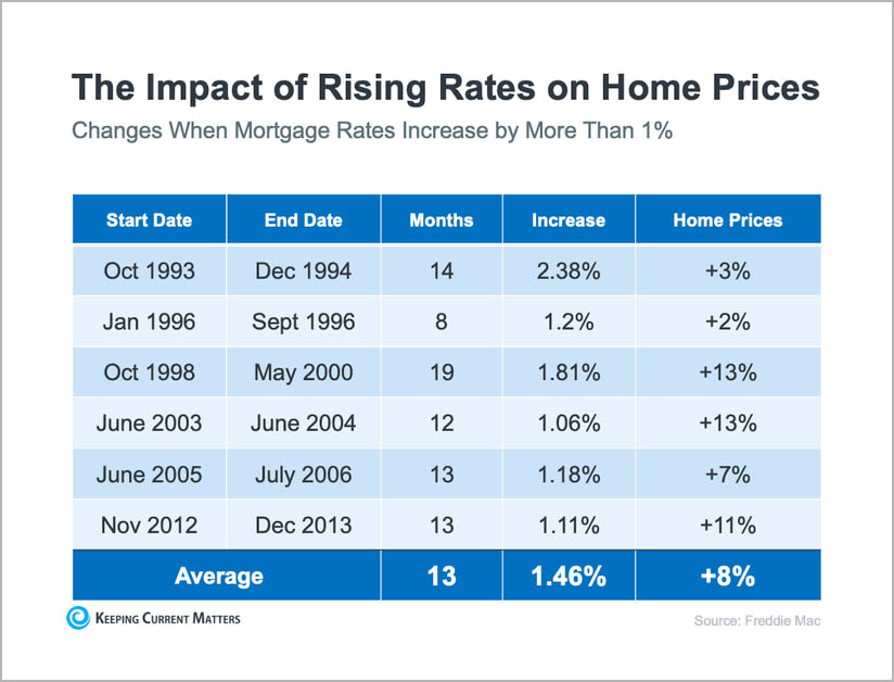 As this shows, mortgage rates rose by at least 1% six times in the last three decades. In each case - contrary to what you might expect - home values went up.