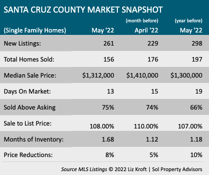 Sales are declining, and the number of listings is increasing in Santa Cruz County. But the homes that are selling are still, on average, selling quickly for well over asking: Median sales prices and year-over-year appreciation rates remain high. But, get this, median prices have declined two months in a row now.
