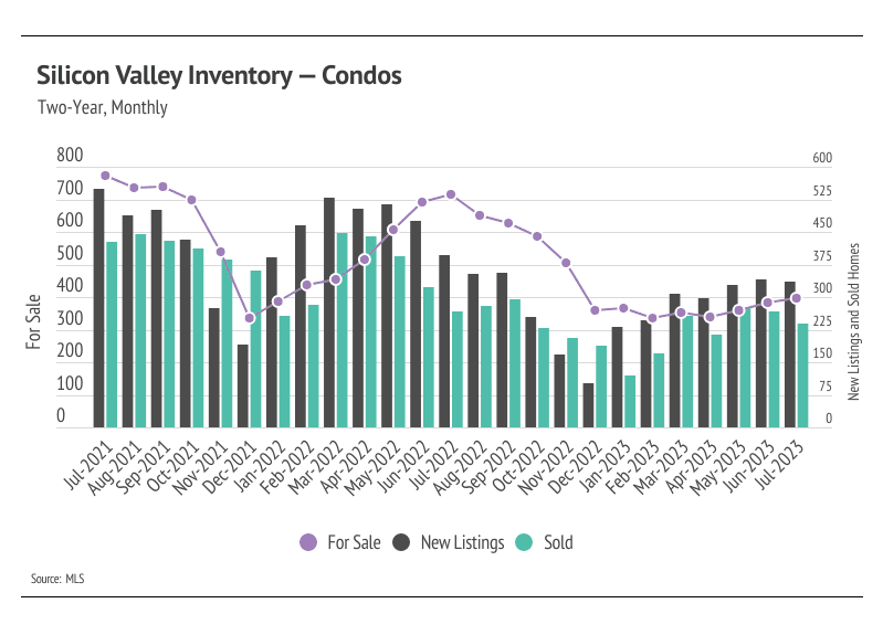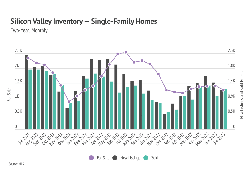 Sales, new listings, and inventory all fell from June to July, likely indicating the start of the typical seasonal decline across supply and demand metrics. Inventory remains depressed but has still grown significantly in 2023, which has helped alleviate some excess demand.
